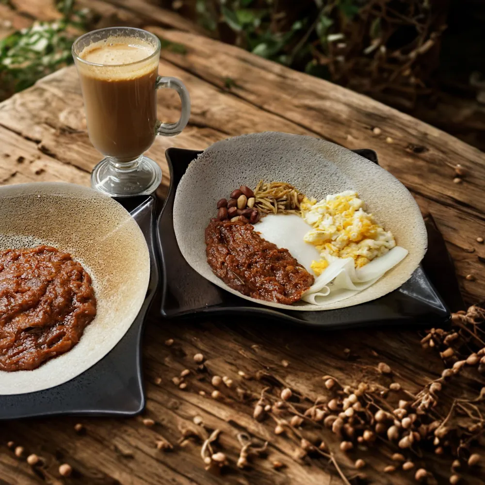 2pcs of soft-centred appam served with sweetened milk, paired with your choice of drink. Light, comforting and perfect any time of day!